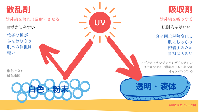 一般的に「紫外線を防止する成分」は大きく2種類「紫外線吸収剤」と「紫外線散乱剤」があります。